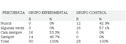 Descripción: en la Tabla 2, se observa que en el post test, en el grupo experimental el 53% de estudiantes casi siempre comprenden la tradición oral y el 47% siempre comprende la tradición oral. Como se puede colegir, si sumamos ambos porcentajes obtendríamos el 100% que prueba la efectividad de la heterogeneidad cultural, los procesos culturales y los contextos que sirven de base para la gestación y desarrollo de la tradición oral de los pueblos. En el grupo control el 57% de estudiantes algunas veces comprenden la tradición oral y el 43% nunca comprenden la tradición oral. De la misma manera, la suma de los estudiantes que nunca aplican la heterogeneidad en la interpretación de la tradición oral y la de aquellos que algunas veces lo emplean; representan el 100% que implica que los docentes del área de Comunicación del 5° grado de educación secundaria de la Institución Educativa La Libertad de Huaraz, casi no están familiarizados con la aplicación de la heterogeneidad en la comprensión de textos de la tradición oral.