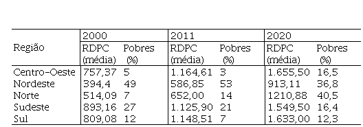 Na tabela 1 pode-se observar que apenas a região Sul proporcionalmente manteve quantidade semelhante de pobres em 2020 (12,3%) em comparação com 2000 (12%). As regiões Nordeste e Sudeste foram as únicas que apresentaram diminuição significativa na quantidade de indivíduos considerados pobres nessa comparação: queda de 12,1 pontos percentuais (p.p.) no primeiro caso e de 10,6 p.p. no segundo caso. As demais regiões, Centro-Oeste e Norte, apresentaram aumento considerável nessa mesma comparação: 11,5 p.p. no primeiro caso e 33,5 p.p. no segundo caso.