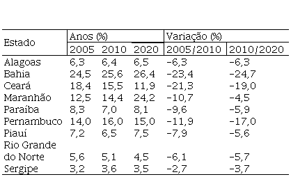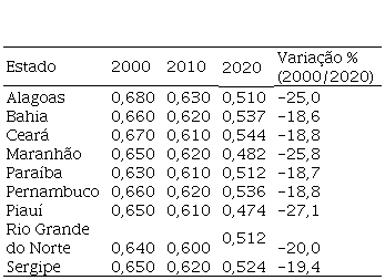 Examinando os índices de desigualdade apresentados na tabela 2, no ano de 2010 todos os estados que constituem a região Nordeste apresentam um índice de Gini acima de 0,600. Os índices obtidos no ano de 2010 são menores que os de 2000, mas ainda se verifica uma concentração muito elevada na renda da região. Já no ano de 2020 pode-se observar diminuição desse índice em todos os estados da região Nordeste, diminuição está de cerca de 20% em comparação com o ano de 2000. O estado em que houve a maior diminuição da desigualdade dada pelo indicador foi o Piauí do ano de 2000 para o ano de 2020 (-27%), seguindo por Maranhão (-25,8%), Alagoas (-25%), Rio Grande do Norte (-20%), Sergipe (-19,4%), Ceará e Pernambuco (-18,8%), Paraíba (18,7%) e Bahia (-18,6%).