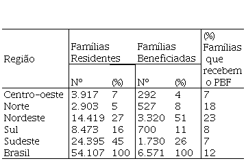 O programa teve início beneficiando mais de seis milhões de famílias por todo o país, sendo 3.320.446 destas famílias só na região Nordeste. É na região Nordeste que se concentra mais de 50% dos benefícios concedidos pelo PBF no país, seguido pelo Sudeste com 25%, Norte com cerca de 10%, Sul com 9% e Centro-Oeste com 5%. Isso deixa clara a desigualdade de renda existente no Brasil diante da grande quantidade de benefícios concentrados em uma única região. Observando a divisão desse número de benefícios entre os estados que compõem a região Nordeste (tabela 3), em média 26% destes benefícios se encontram nas mãos de famílias residentes no estado da Bahia, 25% no Maranhão e 15% no estado do Pernambuco. Esses três estados somam juntos 66% dos benefícios destinados da região.