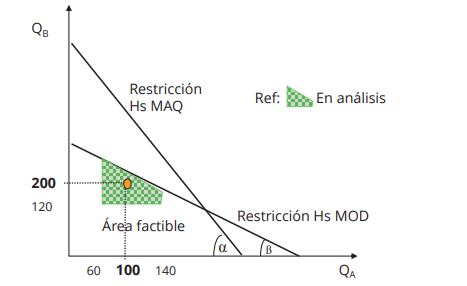 Representando gráficamente, las restricciones definen un área de factibilidad marcada en el Gráfico 10, donde es factible realizar la mezcla actual óptima: