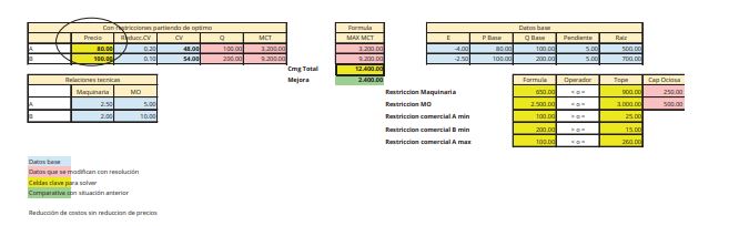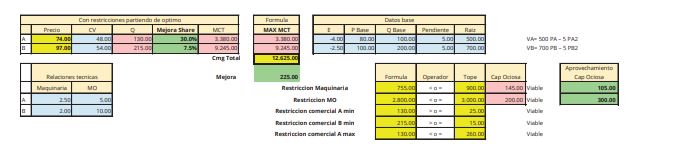 Fuente: elaboración propia.Ante el procesamiento de la función RESOLVER, en las celdas señaladas aparecerán los resultados buscados (precio de A=74$/kg y precio de B=97$/kg), y, dado que las fórmulas están interrelacionadas, cambiarán las cantidades (130kg. de A y 215kg. de B) y los consumos proyectados de los restrictores (755 horas máquina –determinando una capacidad ociosa de 145 hs.-; 2800 horas mano de obra directa – determinando una capacidad ociosa de 200 hs -).