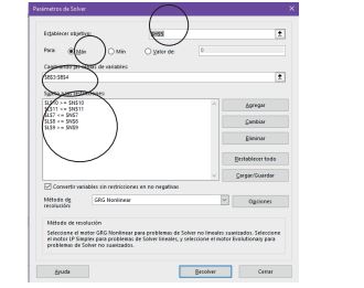 Ejemplificando con el uso de Solver del Excel, entrando a la opción Datos - Solver, se debe ingresar: