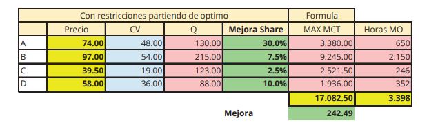 Obteniendo un resultado (Contribución marginal total óptima) igual a $17.079,27. Este resultado es superior en 239,26$ al que se hubiera obtenido en el caso de reducir costos variables sin reducir precio alguno.