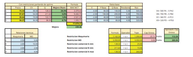 The article studies the cases of poly-production companies with common restrictors that are operating in optimal market conditions with wasted productive and / or commercial capacity, focusing on variable cost optimization projects that allow a proportion of the reduction obtained to be transferred to price, in search of the triple objective: maximization of market share, maximization of profits and use of idle capacity.