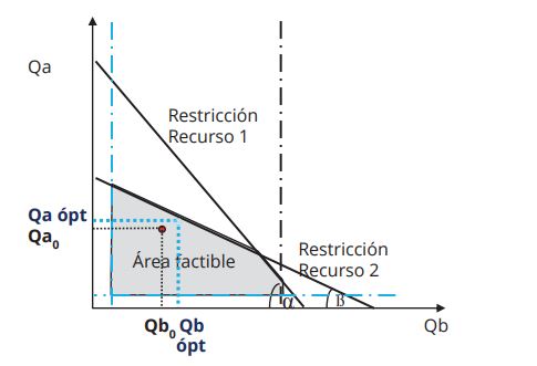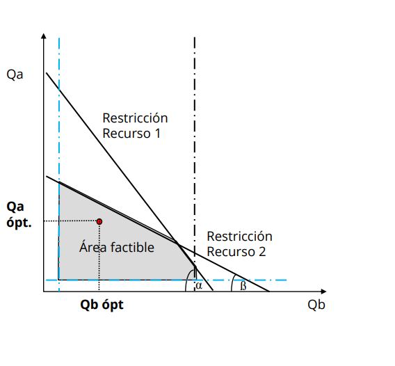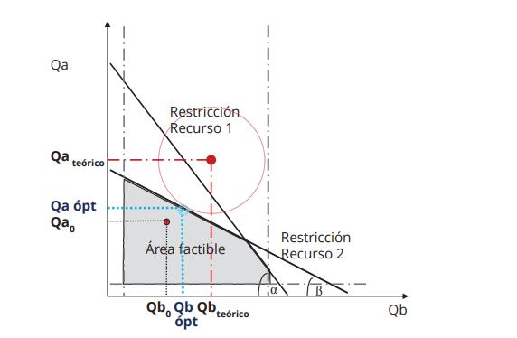 Para los lectores familiarizados con la temática académica de determinación de mezclas óptimas de productos que utilizan uno o más recursos escasos en forma excluyente, esto se puede graficar como puntos óptimos internos del polígono de resolución que no se encuentren sobre los bordes (que representan los máximos de capacidad de los recursos comunes), como se observa en la gráfico 1.