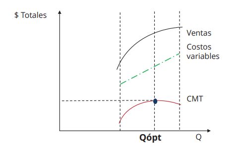 Ahora el óptimo se encuentra a la derecha de la situación actual, con lo cual debemos reducir el precio si quisiéramos maximizar la utilidad, aumentando entonces las cantidades con el triple beneficio buscado: en el mercado ganaremos participación y en el plano de nuestras capacidades aprovecharemos los recursos subutilizados.