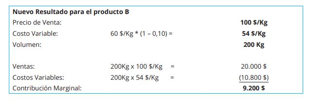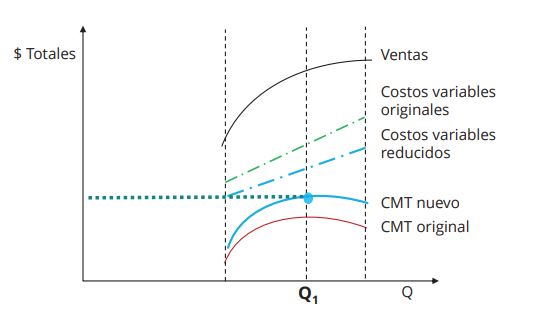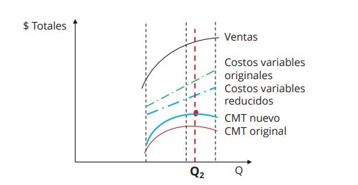 Si la empresa logra una reducción de costos variables sin alterar calidad de producto ni incremento de otros costos, la nueva situación, a mismo precio, y por lo tanto mismo volumen significará un aumento de la Contribución Marginal Total (y obviamente de la utilidad).