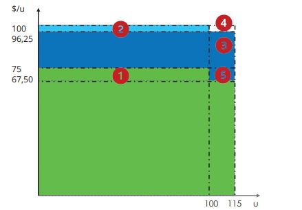 En valores absolutos, ejemplificando con una situación base de precio 100 $/u y volumen 100 unidades:
