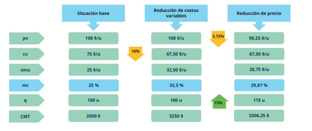 La variación de contribución marginal del 30% lograda por la reducción de costos variables se incrementa al 32,25% por la toma de decisión de reducir el precio para ganar mercado. En el cuadro 2 se explican los efectos que provocan ese incremento.