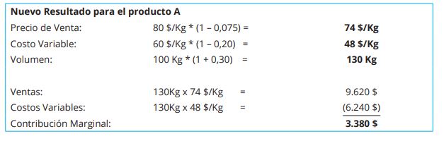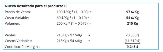 Dada la elasticidad -4 del momento base, resultaría un incremento del 30% del volumen físico, que, no sólo compensará la caída del precio, sino que adicionará contribución marginal total con respecto a la situación de incremento obtenida por la reducción de los costos. En este caso resulta un aumento de la contribución marginal del 69%.