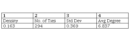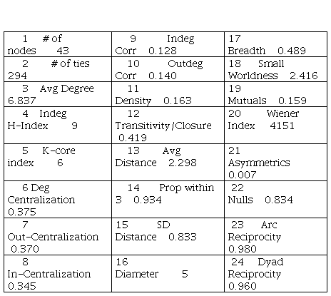 Densidad: cuantitativamente nuestra matriz interaccionada presenta una densidad (Density) del 0.163 (expresado en porcentaje, sería del 16,3%) es decir, estos 264 (No. of Ties) vínculos expresan el porcentaje que abarca sobre el total teórico de posibles interrelaciones, el vínculo promedio (Avg Degree) del 6.837 por nodo. La densidad nos permite entender que una red se encuentra cohesionada, por lo tanto, cuanto mayor es la densidad más significativa será también la cohesión que presenta.