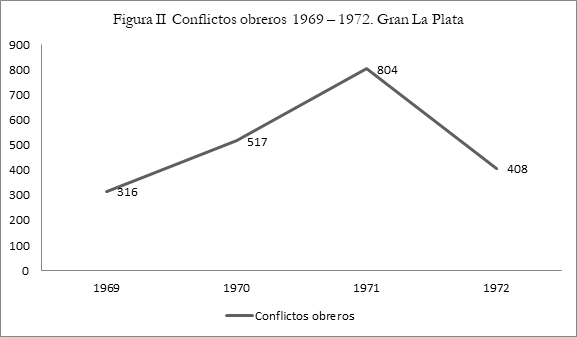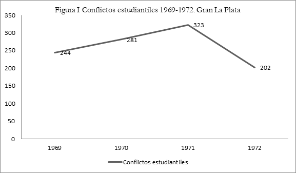 Como ya señalamos uno de los primeros aspectos que nos interesa determinar se refiere a cuál fue la dinámica que adquirió el ciclo de luchas que llevó adelante el movimiento estudiantil en nuestra región de estudio, en función en primer lugar de la intensidad y masividad que evidenciaron los conflictos. Si nos atenemos a un criterio de periodización anual, lo que se puede divisar, en términos generales, es una tendencia de la conflictividad estudiantil similar a la que se puede encontrar para el caso de la clase obrera tanto regional como nacional. Como se puede observar en la figura I, las luchas del movimiento estudiantil evidencian una tendencia creciente a partir de 1969, acompañando en parte la intensificación del proceso de protesta social y radicalización política que tenía lugar en la Argentina. El momento de mayor intensidad de la conflictividad estudiantil platense se alcanzará hacía el año 1971, delineándose así una curva con forma de U invertida, ya que para el año 1972, en un marco signado por la salida política ensayada por el general Lanusse, las luchas acusaran una sensible disminución. 15