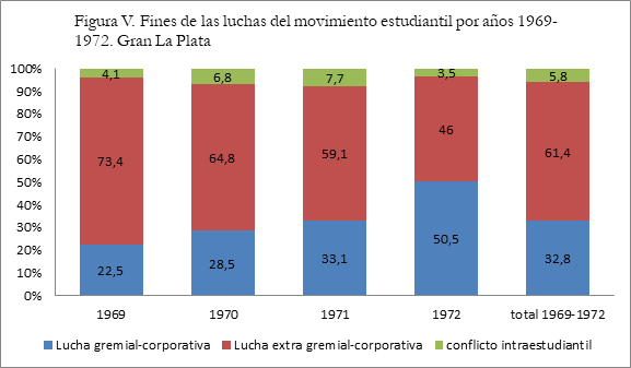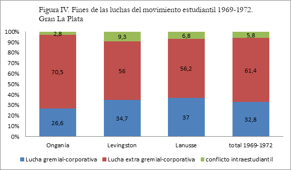 Si analizamos las demandas que articularon los conflictos del movimiento estudiantil, nos encontramos con que gran parte de las luchas estuvieron motorizadas por reclamos de orden extra-corporativo (véase figura IV). 34 A diferencia de lo que encontramos en el caso del movimiento obrero, el 61,4% de los conflictos estudiantiles durante la etapa 1969-1972 se refieren exclusivamente a luchas de carácter político, seguidas en orden de importancia por las luchas de orden corporativo (32,4%) y en última instancia y con valores marginales, por los conflictos al interior del propio movimiento estudiantil, es decir entre las distintas tendencias, agrupaciones, centros de estudiantes, etc (5,8%). 35 Dichos datos, nos estarían indicando en una primera instancia, el mayor nivel de politización que presentaba en términos generales el movimiento estudiantil, por lo menos en comparación con las tendencias observadas para el movimiento obrero regional. Ésta mayor politización se volvía más aguda, además, en los momentos en los que en el plano nacional recrudecía la política de represión, en tanto que los reclamos corporativos (tales como las luchas por el ingreso irrestricto) perdían momentáneamente cierta centralidad.