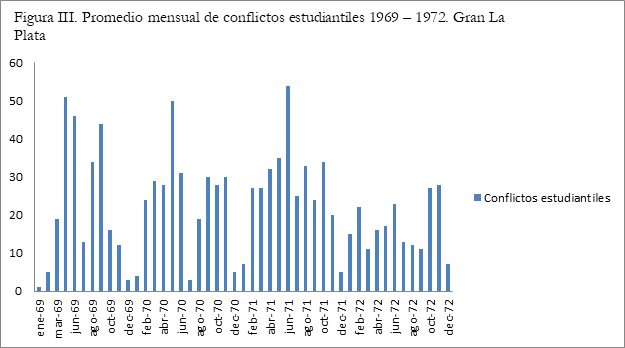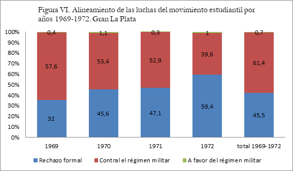 Más allá de esta sucesión de tendencias ascendentes y descendentes, del análisis realizado se desprendió que el movimiento estudiantil platense se caracterizó no solo por haberse expresado en formas de luchas que dieron cuenta de importantes grados de masividad, sino también de considerables niveles de combatividad y de radicalización política, en particular si es contrastado con las tendencias registradas para el caso del movimiento obrero regional. El movimiento estudiantil logró, de algún modo, articular las demandas más corporativas o circunscriptas a cada facultad a un movimiento antidictatorial.