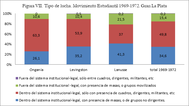 Para complementar el panorama podríamos analizar otra de las variables que hemos utilizado para aproximarnos al nivel de radicalización de los enfrentamientos, es decir si las acciones se ubican dentro o fuera de los marcos que establecía el sistema institucional-legal y si en las mismas actúan solo las dirigencias o se evidencia un mayor involucramientos de cuerpos. En consonancia con lo que venimos analizando, en la figura VII se llega a visualizar cierta tendencia en las luchas del movimiento estudiantil a exceder los marcos de subordinación a las dirigencias o a las pautas marcadas por el sistema institucional legal. Si bien bajo todo el periodo 1969-1972 los conflictos estudiantiles que se desarrollan dentro del sistema institucional legal y en los que además solo hay presencia de cuadros dirigentes o militantes (es decir donde las dirigencias ?operan solas?, sin las bases) representan casi el 50% de las acciones (49,8%), dicho valor no solo es sensiblemente menor al que encontrábamos en el caso de los conflictos del movimiento obrero (70,5%), sino que además presenta una dinámica decreciente a medida que nos acercamos al final de nuestra etapa de estudio.
