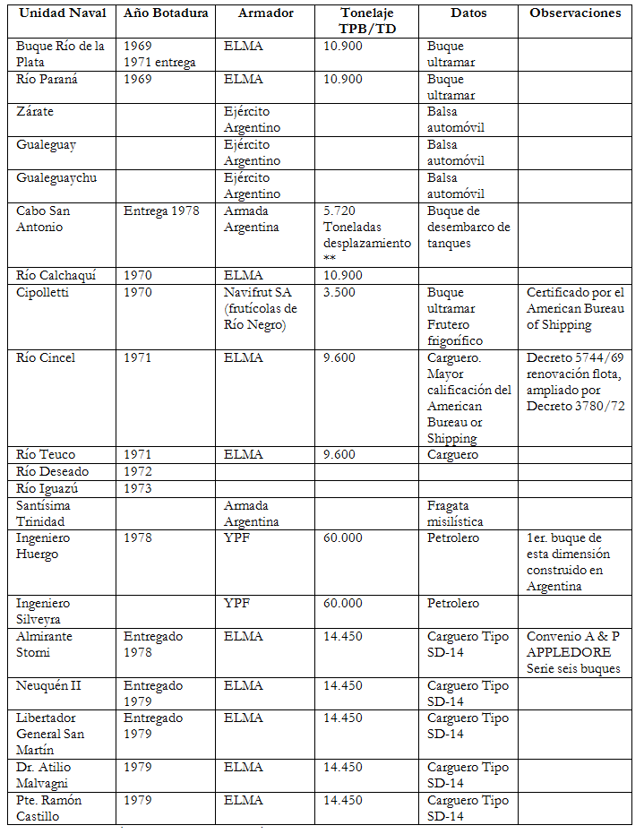 El conjunto de acciones empresariales aquí revisadas, que implicaron diferentes prioridades y énfasis a lo largo de esta temporalidad, fueron secundarias respecto del objetivo de alcanzar la producción seriada de las unidades navales.42 El primer logro en este sentido estuvo vinculado a la empresa estatal ELMA con la serie de buques denominados "Ríos" y los cinco Cargueros Tipo SD-14.