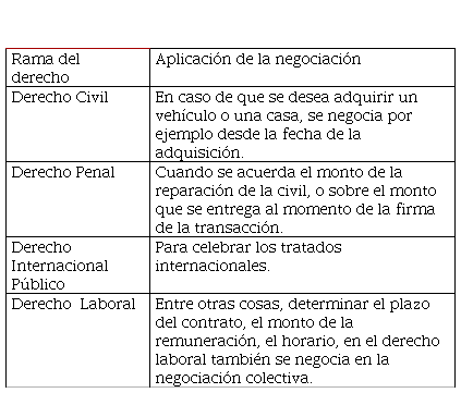 Como bien señala Torres (2011), la negociación no pertenece a una rama del derecho. Sin embargo, es aplicada a gran variedad de áreas y ramas del derecho para diversos fines, el siguiente cuadro nos aporta una visión general de su aplicación ( ver tabla, 2).