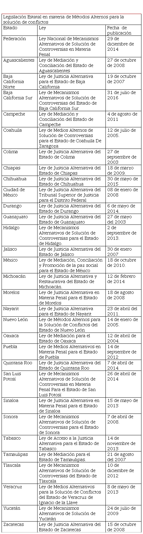 La siguiente tabla muestra las fechas en las que los Estados incorporaron el tema de los métodos alternativos para la solución de conflictos en su legislación (ver tabla 3).