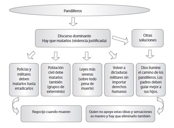 Por ejemplo, el artículo “Indiferencia y espantos: relatos de jóvenes y pandillas en la prensa escrita de Guatemala, El Salvador y Honduras” (Marroquín, 2007) concluye que los medios reproducen el discurso oficial que dicta que las pandillas son el enemigo a vencer y que, por lo tanto, los gobiernos que luchen contra ellas merecen la aprobación. Este discurso se magnifica en períodos electorales.