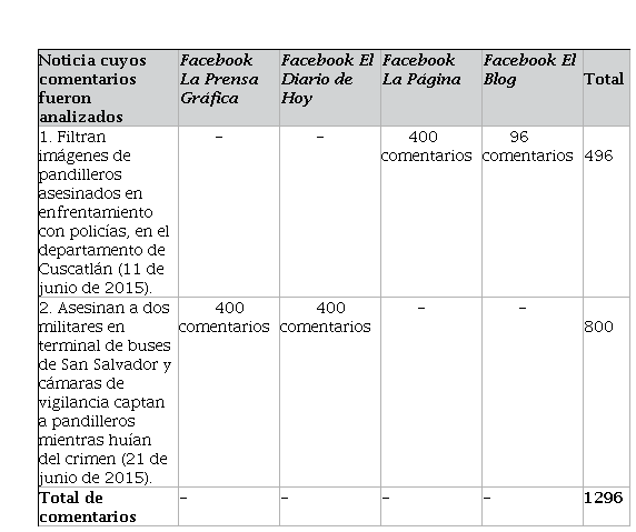 Para la muestra se escogieron las notas sobre los siguientes acontecimientos: la filtración de imágenes de supuestos pandilleros asesinados en lo que las autoridades llamaron un enfrentamiento con policías (11 de junio de 2015) y el asesinato de dos militares en una terminal de buses, el cual incluía la publicación de imágenes de los presuntos pandilleros homicidas que huían del crimen, captadas por cámaras de videovigilancia (21 de junio de 2015). Los comentarios analizados corresponden a las noticas sobre estos hechos en los muros de Facebook de los cuatro periódicos en versión digital más leídos del país, de acuerdo a datos de 2015 del sitio de cibermetría alexa.com: El Diario de Hoy (elsalvador.com), La Prensa Gráfica, El Blog y La Página. En el caso de los pandilleros asesinados, se tomaron en cuenta los “post” en El Blog y La Página, pues estos medios publicaron las fotos de los cadáveres de forma explícita. La otra noticia se dejó para los dos restantes periódicos. Se analizaron los comentarios subidos en los días inmediatos al evento, hasta las primeras 400 opiniones emitidas o, en su defecto, la totalidad de ellas si la cifra no alcanzaba ese número. En todos los casos, salvo en El Blog, la cantidad total de participaciones rondaba las 500 (a veces más, a veces menos), por lo que la muestra seleccionada se consideró suficiente para obtener el discurso. El resumen de estos datos se puede apreciar en la siguiente tabla.