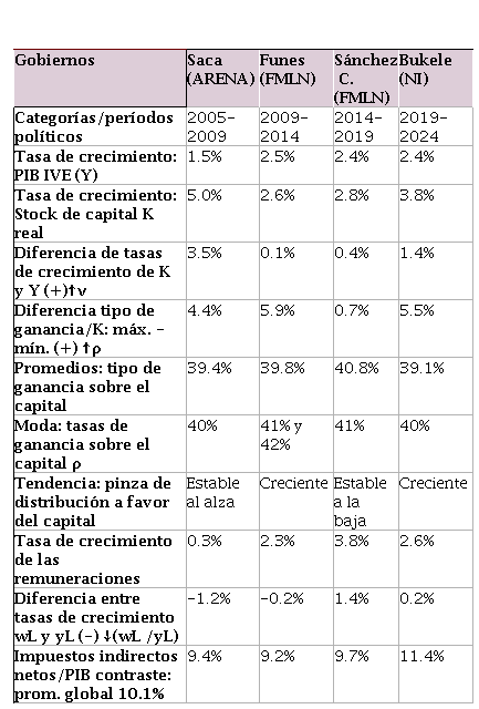 Gobierno de Bukele (NI): bajo este gobierno, en su primer período, el país hizo frente a la pandemia de covid-19 con subsidios e inversiones importantes en salud. Por ello, conviene destacar que el valor máximo de la participación de las remuneraciones es el de 2020, de modo similar, el valor mínimo de la participación de los excedentes de las sociedades ocurre también en el mismo año. Por otra parte, el valor máximo de la participación de los excedentes de las sociedades (capitalistas) es el de 2022 (manteniéndose casi constante hasta 2024) y el valor mínimo de la participación de las remuneraciones ocurre en 2023 (en 2024 es aproximadamente el mismo).