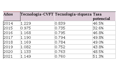 En 2015, debido al sesgo tecnológico para generar bienestar de los trabajadores, la tasa potencial se reduce con respecto a lo observado en 2014, aunque la eficiencia se eleva tanto para provocar bienestar en la fuerza de trabajo humana como para elevar la riqueza, que en el capitalismo es básicamente objeto de apropiación por los empresarios. La tasa más alta, debido a la disminución sistemática de la eficiencia para generar bienestar de los trabajadores ocurre en los primeros dos años de Bukele, elevando el coeficiente tecnología-VCFT desde 1.08, en el último año de Sánchez Cerén, a 1.15 en 2021. Es importante observar que las tasas potenciales de crecimiento y desarrollo de cualquier proporción pueden estar asociadas a distintos comportamientos de los coeficientes sociotecnológicos. En la figura 7 pueden verse las tendencias de los coeficientes sociotecnológicos y de la tasa potencial de crecimiento y desarrollo.