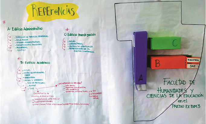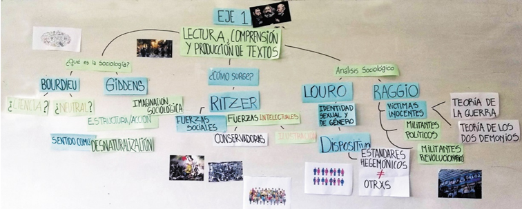 En segundo lugar, en el marco del curso tuvo lugar una serie de actividades y talleres propias del ethos institucional de la Facultad de Humanidades y Ciencias de la Educación, y de la Universidad a la que pertenece. Por un lado, se llevó adelante un taller de géneros para introducir a lxs estudiantes en una cultura institucional con perspectiva de géneros. Por otro lado, se realizó un recorrido guiado por el predio en donde se encuentra emplazada la FaHCE–el exBatallón de Infantería de Marina 3–, que funcionó como centro clandestino de detención durante la última dictadura cívico-eclesiástico-militar en el país–, con el fin de conocer la historia y memoria desde un enfoque de los Derechos Humanos. Por último, en este mismo sentido, se desarrolló una clase teórica dictada por Aníbal Viguera, profesor titular de la cátedra Análisis de la Sociedad Argentina (asignatura perteneciente al plan de estudios de las carreras de Sociología), sobre la dictadura de 1976-1983. Esta actividad presenta un objetivo triple: por un lado, se conecta con la propuesta de visita guiada por el exBIM3, y, en ese sentido, se enmarca en las políticas de memoria y derechos humanos; por otro, busca introducir a lxs estudiantes en la dinámica propia de una clase teórica-expositiva; finalmente, se propone ejercitar la toma de apuntes. En función de ello, en los encuentros anteriores a la clase se anticiparon algunas herramientas para la toma de apuntes, mientras que en los encuentros siguientes se trabajó sobre los apuntes realizados, a partir de mapas conceptuales que reunían las principales ideas y de correcciones cruzadas entre lxs ingresantes.