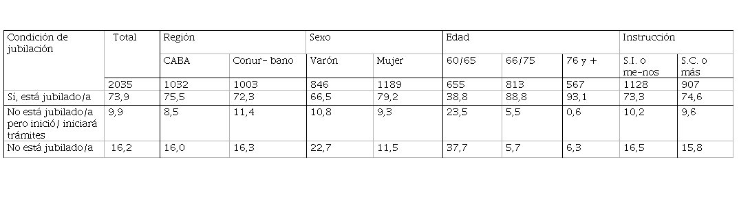 En lo que se refiere a la condición de jubilación, el 74 % percibe jubilación; esta cifra es algo superior en CABA que en los 24 partidos del Conurbano. Un 10 % no accedió a este beneficio pero planifica iniciar los trámites para jubilarse, mientras que el 16 % restante no tiene jubilación y no piensa tenerla.