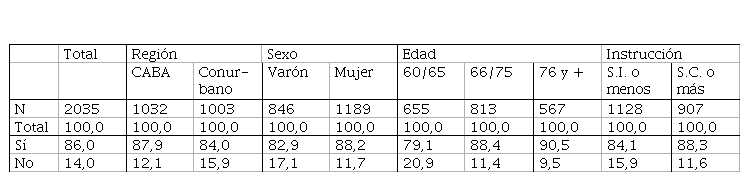 Casi la totalidad (n: 2.035) de los encuestados proviene, en partes iguales, de la CABA y del Conurbano, con una representación porcentual mayor de mujeres (58 %), que se explica por la sobremortalidad masculina observable en las edades estudiadas (60 años o más). El mayor peso relativo de las personas encuestadas se encuentra entre los 66 y los 75 años (el 40 %). En cuanto al nivel de instrucción, predominan las personas con escolaridad secundaria incompleta o menos. Tres cuartas partes de los encuestados viven en hogares con dos personas o más y el 55 % de ellos convive con su pareja: especialmente los varones y los más jóvenes, debido a la viudez.