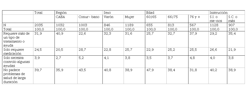También como consecuencia de esa distribución por edad de la población, el 32 % afirma requerir más de un tipo de tratamiento o ayuda (41 % en la CABA contra el 23 % en el Conurbano de Buenos Aires), hecho que crece cuando aumenta el nivel de instrucción. Una cuarta parte de los encuestados declara necesitar solo medicación (21 % en la CABA y 28 % en el Conurbano) (Cuadro N° 3).