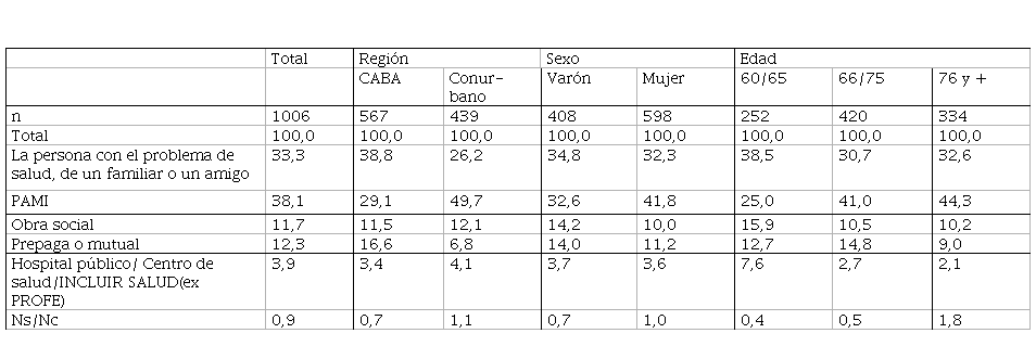 Más de la mitad de los encuestados atiende su salud a través del PAMI (53 %) y casi un tercio lo hace mediante otra obra social (30 %). El hospital público es utilizado por el 9 % y las prepagas por el 7 %. Estas cifras sufren alteraciones al analizar la distribución por región, sexo, edad e instrucción, ya que la cobertura del PAMI es mayormente utilizada por los residentes del Conurbano, las mujeres, las personas de 75 años o más y aquellas con niveles inferiores al secundario completo. El 5 % de las personas afirma contar con Certificado de Discapacidad