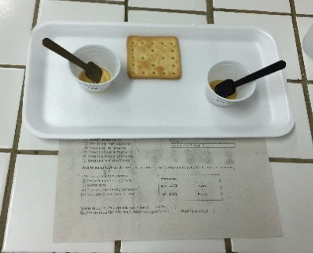 As duas amostras foram servidas em copos de plástico, sobre uma bandeja, com duas colheres, acompanhado de uma bolacha salgada, um copo com água à temperatura ambiente, para cada degustador conseguir distinguir os sabores de ambas as amostras, pois, pelo fato de serem parecidas, o sabor acaba ficando induzido no paladar após a primeira provadura. Todos os utensílios usados pelos avaliadores na análise eram descartáveis, e as amostras estavam identificadas com 3 dígitos aleatórios (Figura 1).