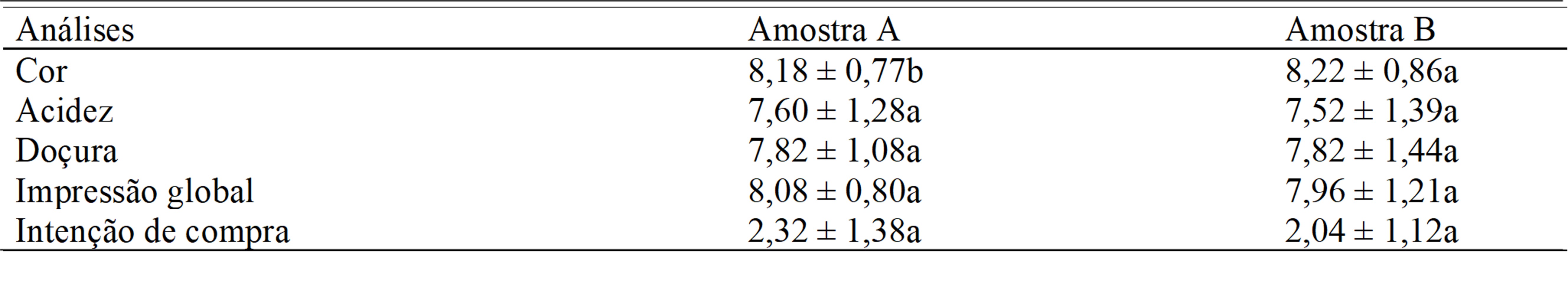 Através da intenção de compra, o dono do produto consegue relacionar e gerar dados, criando planos estratégicos para deliberar uma possível demanda (REINERI; VALENTE, 2013). Sendo assim, os resultados das amostras A e B foram classificados como “Provavelmente compraria (2), comprovando seu potencial de mercado, caso estas fossem comercializadas.