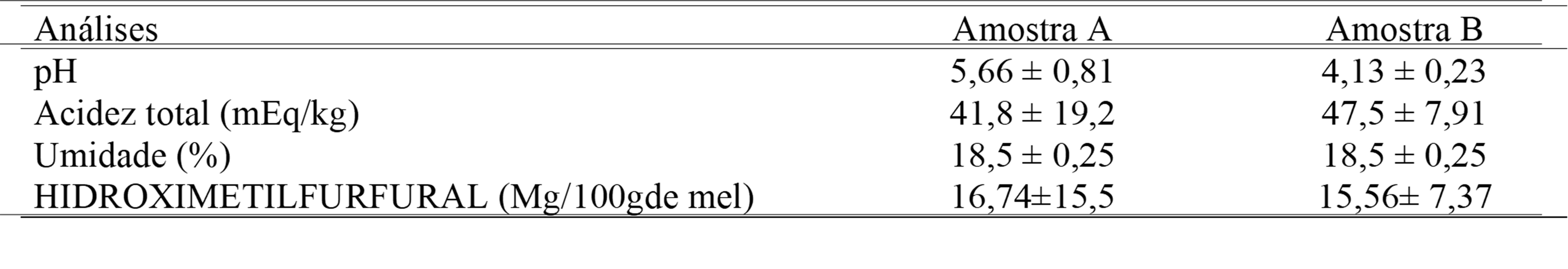 Os valores de HMF também não mostraram diferenças significativas, tendo a amostra A (16,74) um valor médio ligeiramente maior do que a amostra B (15,56). Este se forma a partir da decomposição da frutose, avaliando a característica do mel e identificando a qualidade e possíveis adulterações (MARCHINI et al., 2005). Sendo o índice de HMF máximo de 60 mg/kg de acordo com a legislação (BRASIL, 2000), as amostras se encontram dentro dos valores estabelecidos, visto que o mel utilizado não foi aquecido, nem adicionado xaropes de açúcar, que são fatores que favorecem a formação do HMF.