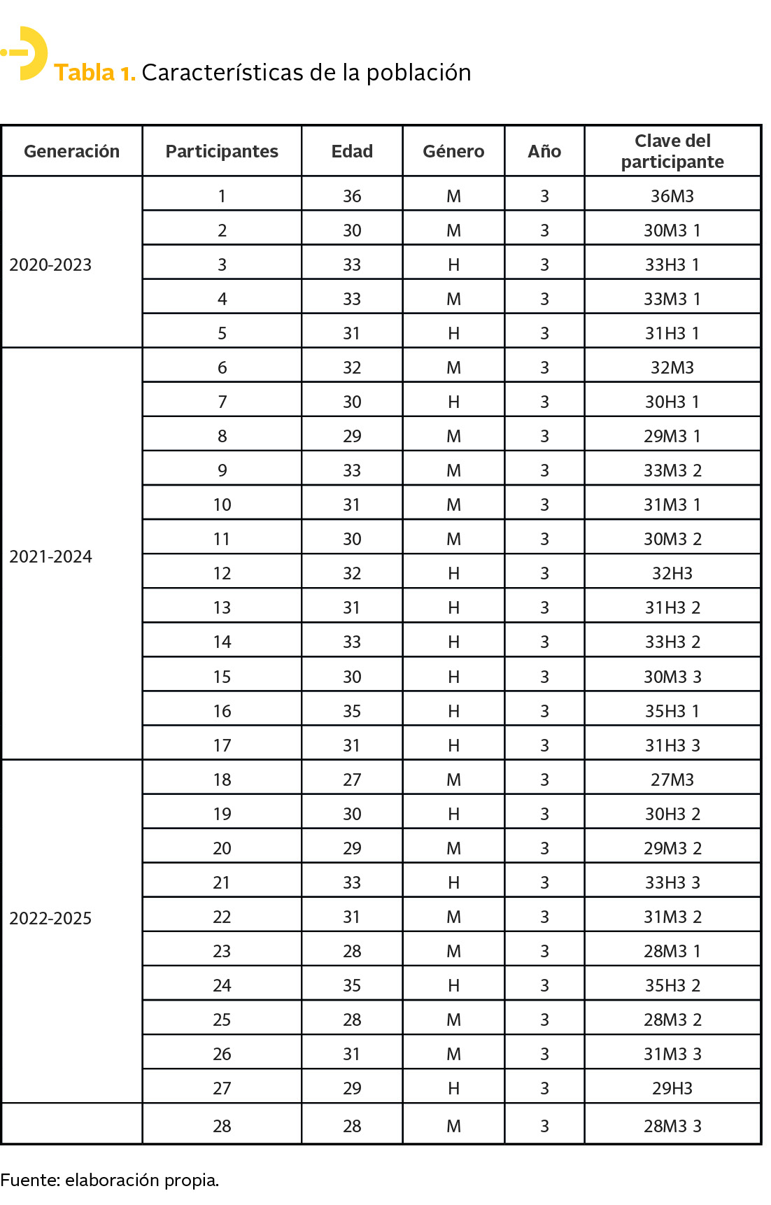 Se trata un estudio cualitativo, de corte exploratorio, con datos de una sede hospitalaria de la especialidad en Anestesiología de Xalapa, Veracruz, México. La selección de los participantes fue por invitación a todos los residentes que cursaban el último año del posgrado de las generaciones de 2020-2023 (cinco médicos), 2021-2024 (12 médicos) y 2022-2025 (11 médicos) (tabla 1). Se presentó el consentimiento informado a todos los participantes, garantizándoles el anonimato y la confidencialidad de sus datos. Cabe destacar que los 28 médicos aceptaron participar en la investigación.