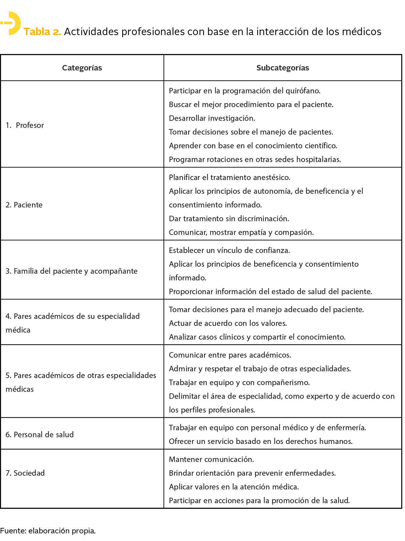 En la tabla 2 se presentan los resultados del análisis de siete categorías previamente establecidas y 26 subcategorías emergentes, las cuales hacen referencia a la interacción de las actividades profesionales entre el médico y diferentes actores: pacientes, familia o acompañantes, colegas, el equipo de trabajo y sociedad, esto último para incluir algunos casos en ambientes externos a la sede hospitalaria. Por lo tanto, se identificaron aspectos de las responsabilidades de los médicos con base en diversos roles, por ejemplo, el de estudiante, médico general y médico especialista en formación.