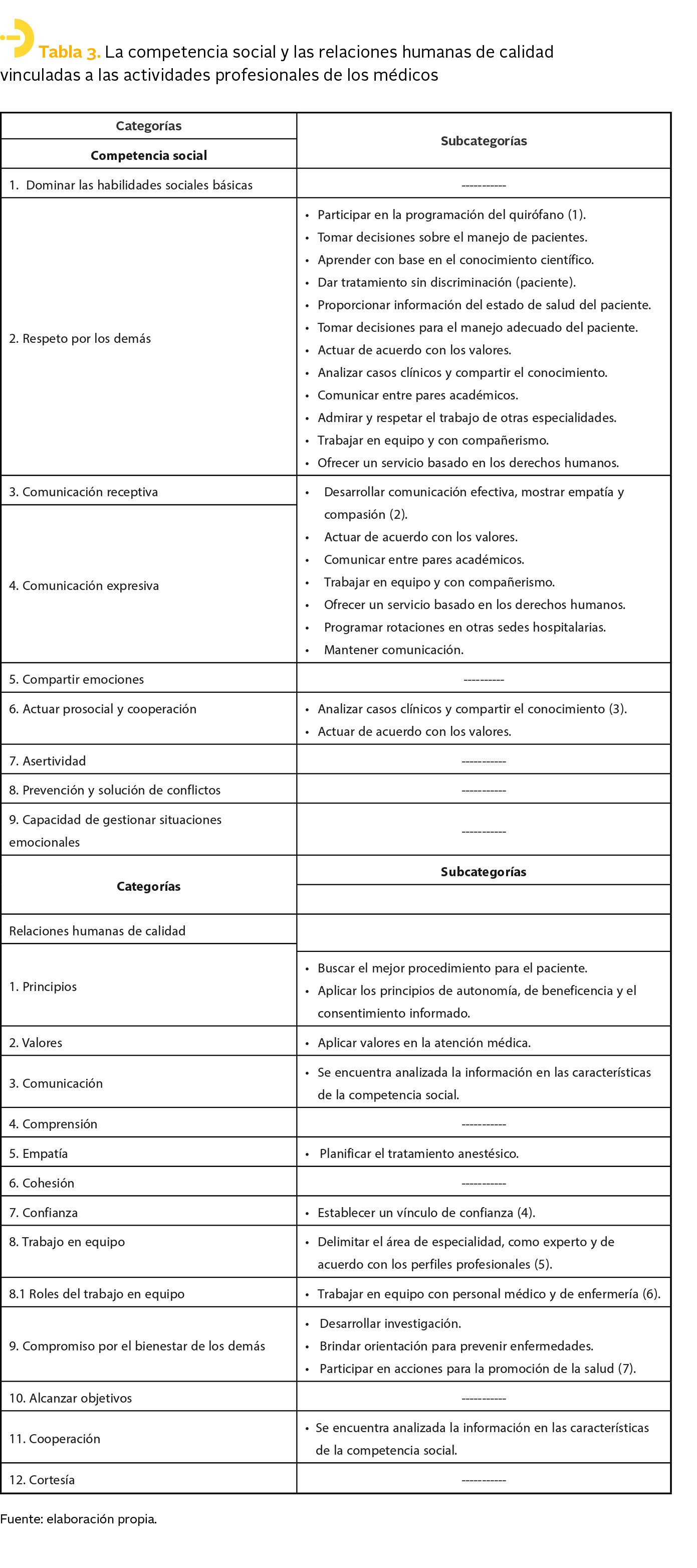 En la tabla 3, tal y como se presentó en el apartado de fundamentación teórica, el análisis de los resultados usa la conceptualización de la competencia social y relaciones humanas de calidad para identificar su vínculo con las actividades profesionales que realizan los médicos.