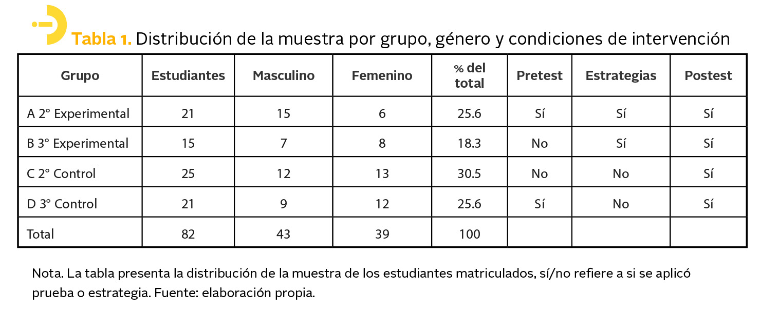 El diseño del estudio es cuasiexperimental con cuatro grupos: dos experimentales (n = 36) y dos de control (n = 46), con mediciones pre y post. El alcance es explicativo‑comparativo, con seguimiento inmediato posterior a la intervención, se desarrolló bajo los principios éticos de la Declaración de Helsinki. Los grupos se conformaron por conveniencia para asegurar equilibrio por grado y comparabilidad en las variaciones asociadas a la edad.