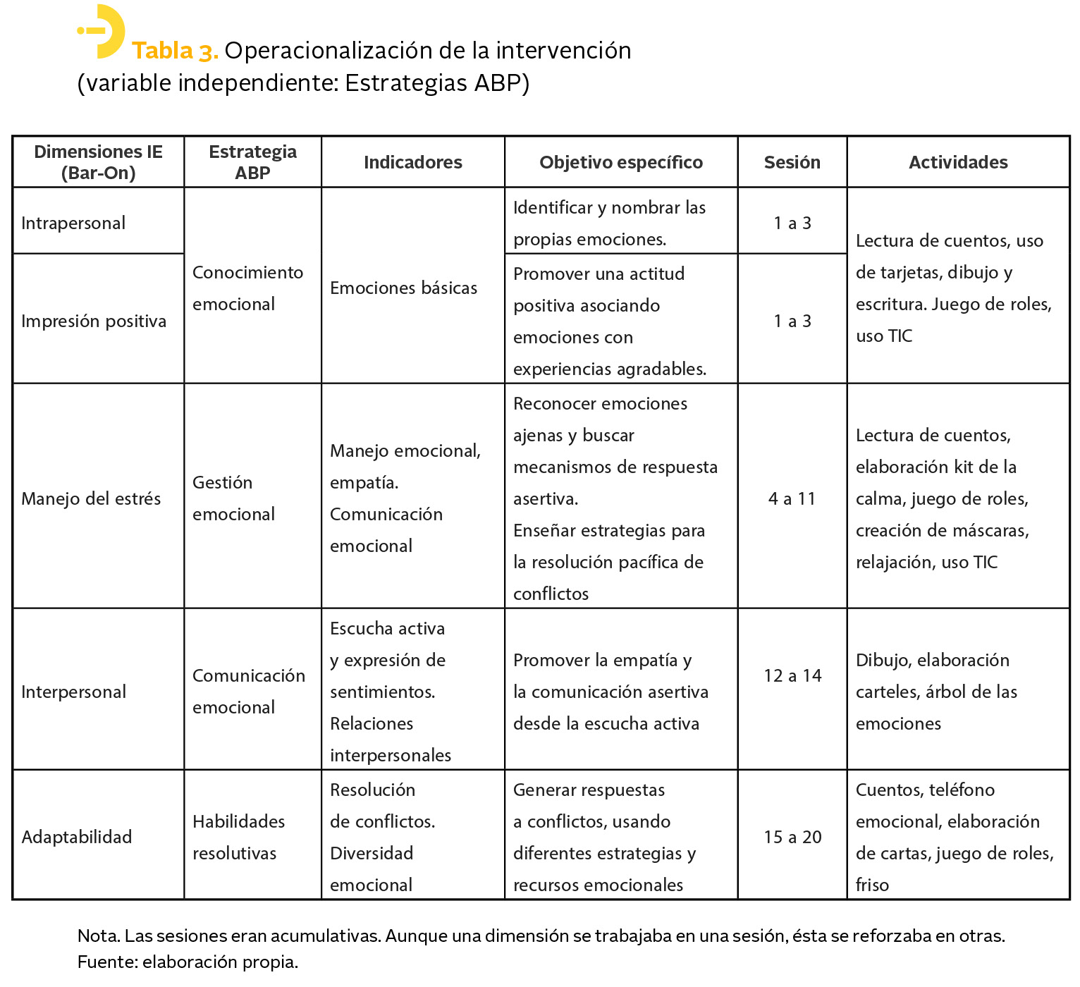 El diseño de la intervención basada en ABP se concibió de manera integral, tras reconocer que las dimensiones de la IE están interconectadas. Por ello, las estrategias didácticas se planificaron para favorecer al mismo tiempo varias de estas dimensiones. La tabla 3 muestra dichas relaciones: por ejemplo, la fase de Gestión emocional (sesiones 4-11), centrada en la empatía y en el manejo de emociones propias y ajenas, buscaba fortalecer principalmente el Manejo del estrés y la Comunicación emocional. De forma similar, las Habilidades resolutivas (sesiones 15-20), orientadas al trabajo de resolución de conflictos, estaban dirigidas a potenciar la Adaptabilidad y la dimensión Interpersonal. Esta planificación refleja que las competencias emocionales no se desarrollan de manera aislada, sino a través de actividades que promueven su integración.