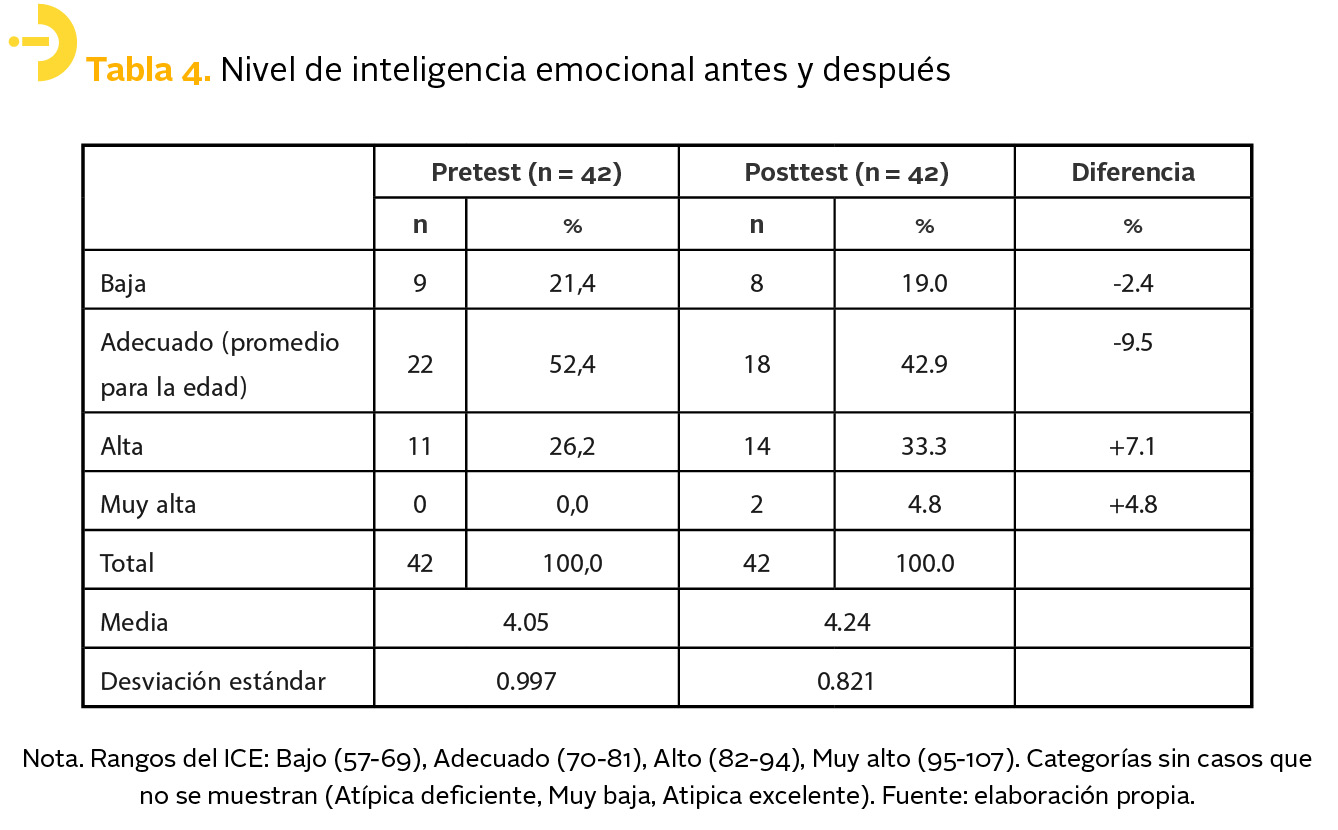 En la tabla 4 se presentan los niveles de inteligencia emocional antes y después de la implementación de las estrategias didácticas basadas en ABP. En el pretest, 52.4 % (22) de los estudiantes tenía un nivel adecuado para su edad, mientras que 26.2 % (11) mostró un nivel alto de inteligencia emocional. En el postest, 19 % (8) de los alumnos permaneció en nivel bajo, lo que representa una ligera disminución frente al pretest. Además, se observó un incremento en el número de estudiantes en el nivel alto, que alcanzó 33.3 % (14), e incluso 4.6 % (2) logró un nivel muy alto.