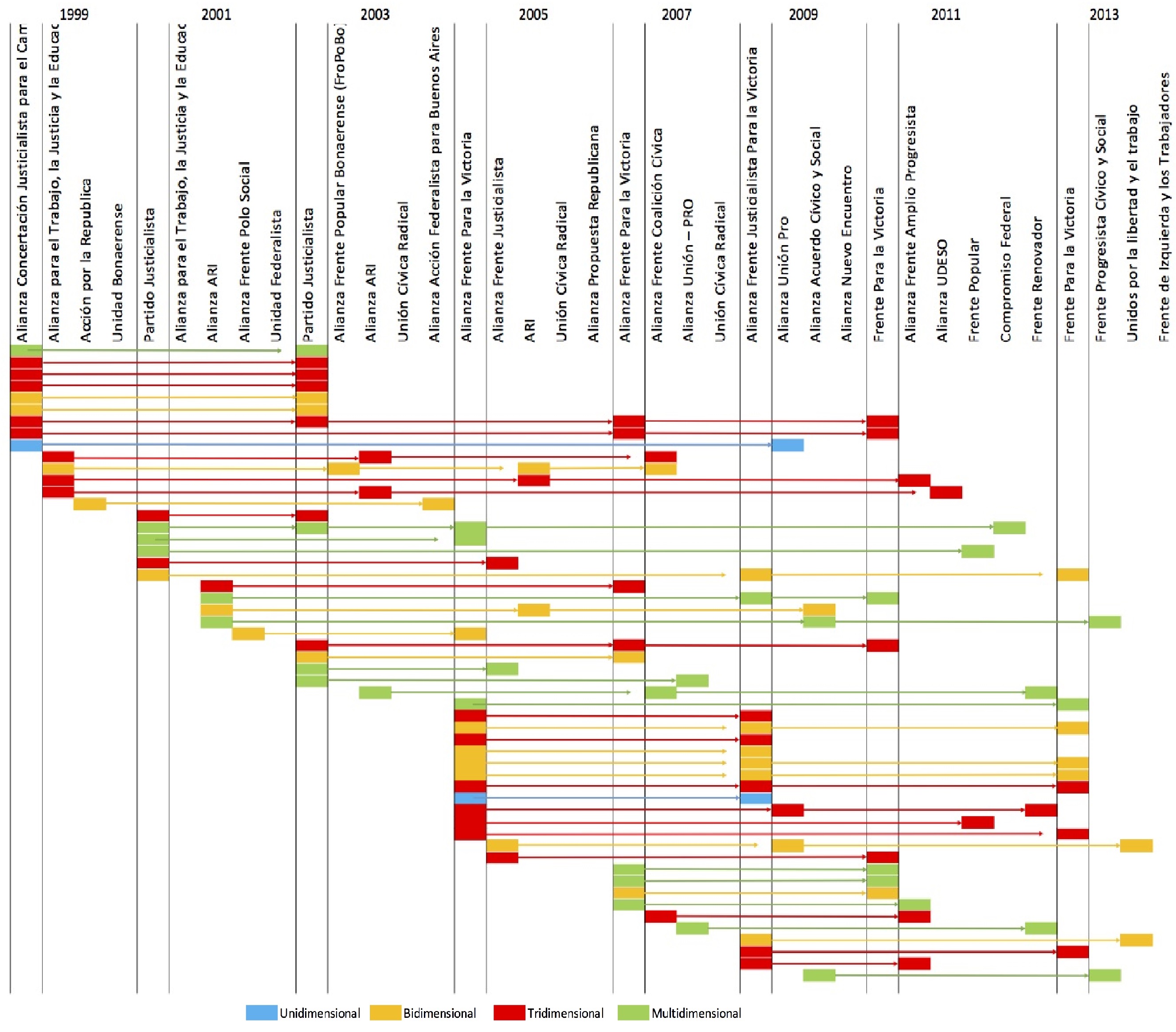 El análisis se orienta a conocer qué estructuras de capital político resultan más frecuentes en cada una de las agrupaciones que obtuvieron representación legislativa nacional durante el período. Es decir, a establecer posibles perfiles diferenciales tanto entre partidos como en sucesivas cohortes, teniendo en cuenta también los cambios de partido. Una de las dificultades para retratar al conjunto de los partidos que obtuvieron representación legislativa es la permanente emergencia de nuevos partidos y frentes/coaliciones; por eso, el análisis busca seguir a los individuos, ver su permanencia o no, sus cambios de partidos/coaliciones. Hay actores que hacen existir nuevas coaliciones (o actrices). Mapear a estos actores y las estructuras de capital político que portan es una parte de la cartografía general de los partidos políticos, que requiere ser complementada con otras regiones, pero que puede ayudar a orientarse en la decodificación del paisaje que presenta la política bonaerense.