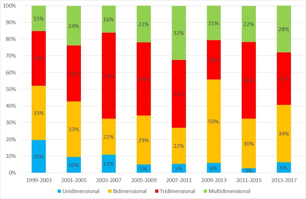 En función del criterio de medición utilizado, es decir, de la cantidad de especies de capital que porta cada actor particular,5 la evidencia muestra una preponderancia sostenida –aunque en proporciones variables– de estructuras de tipo bidimensional o tridimensional a lo largo del período, como así también la persistencia de un margen de actores que ingresan a los contingentes legislativos con una estructura de capital político unidimensional (un 8 % en promedio). Es decir, no se verifica la hipótesis de una complejización creciente del acceso al campo para quienes detentan menores niveles de profesionalización al menos para llegar a ocupar el cargo de diputado nacional.