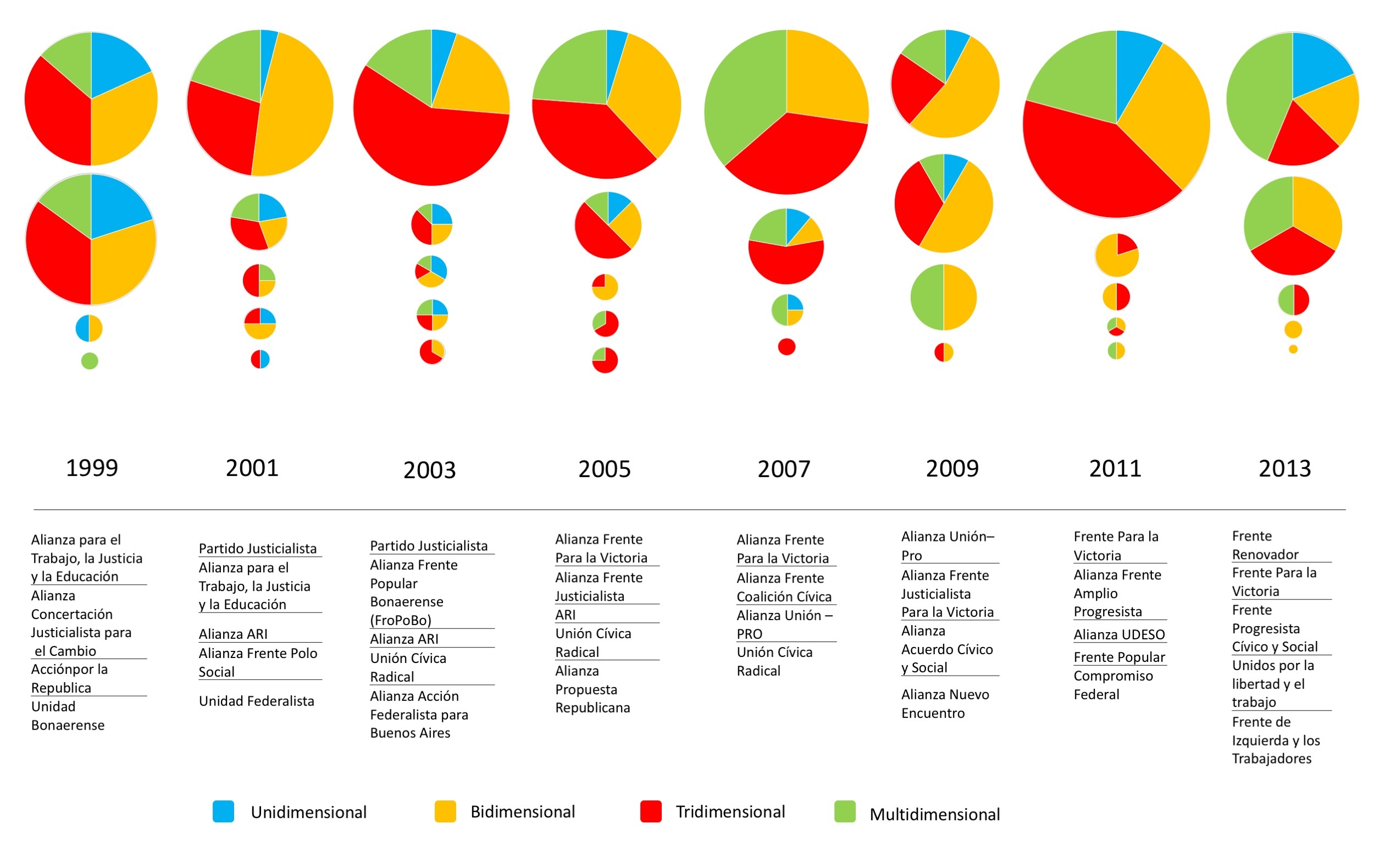 Como se puede observar, los partidos/coaliciones mayoritarias no presentan una lógica uniforme en cuanto a las estructuras de capital político que portan los actores que los integran: si bien parecen predominar estructuras del tipo tridimensional, en la mayor parte del período las fluctuaciones son muy amplias como para expresar una tendencia. En cambio, los partidos minoritarios sí parecen tener una proporción decreciente de actores con estructuras unidimensionales. Esto puede deberse a que iniciarse en la competencia desde una estructura de menor peso en el escenario político implica una apuesta más arriesgada, que sólo cierto tipo de actores estaría dispuesto a realizar: aquellos que tienen mayor cantidad de recursos reconvertibles como capital político en sus trayectorias personales.