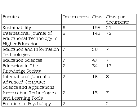 Bibliometrix, 2023En cuanto a las revistas con más productividad, destacan Sustainability, Education and Information Technologies y Education Sciences, con 9 publicaciones para la primera revista y 7 para las dos últimas (Tabla 1). En cuanto a las citas, también es Sustainability la que más citas tiene, pero después el orden no coincide con las más productivas, ya que le sigue International Journal of Educational Technology in Higher Education con 143 citas (más citas por documento también).