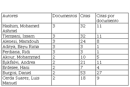 En cuanto a los autores, los más productivos son Hashim, Tlemsani o Alenezi, entre otros, con 3 documentos. Como se observa en la Tabla 2, el que más impacto tiene en cuanto a citas recibidas, es Burgos con 53 citas y 2 documentos.