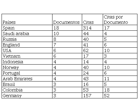 Para finalizar el análisis descriptivo de la base, en la Tabla 3 quedan reflejados los principales países que investigan sobre la TD en IES. Aunque España es el país que más documento publica y más citas recibe en valor absoluto, no es el que más citas obtiene por documento. El país que más citas recibe después de España es Alemania, y es el que más citas tiene por artículo.