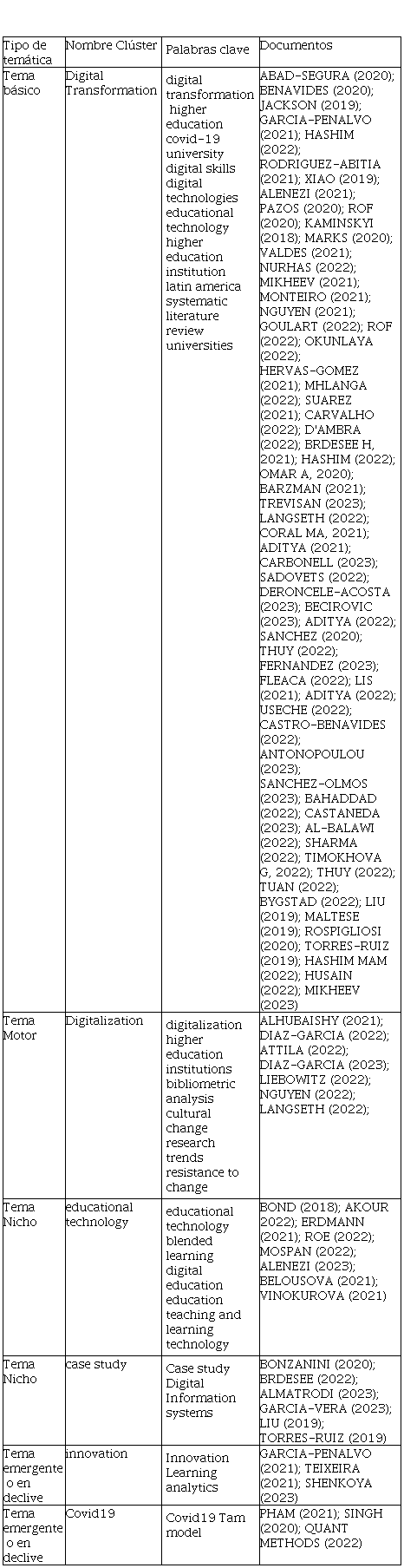 Una vez obtenida la visión general de las palabras claves más co-ocurrentes dentro de la base y su tendencia, se pasa a analizar los clústeres temáticos. Los 6 clústeres son denominados innovation, digital transformation, educational technology, case study, Covid19 and digitalization. Todos ellos se sitúan en función del grado de relevancia, en el eje de las abscisas, y del grado de desarrollo, en el eje de las ordenadas. Si el tema tiene una alta relevancia, determinado por su centralidad, pero un bajo desarrollo por su baja densidad, se considera un tema básico. Si, por lo contrario, es de alto desarrollo sería un tema motor. Por otra parte, si el grado de desarrollo es alto pero la relevancia baja, sería un tema emergente o tema en declive, o si el grado de desarrollo es alto y el de relevancia es alta, sería un tema considerado como nicho. En la tabla 4, se recogen todos los datos que propone la herramienta con los primeros autores de los documentos que van en cada clúster. Hay 12 artículos que la herramienta no ha clasificado, y por lo tanto se han incluido realizando un exhaustivo análisis de las palabras clave y de los artículos.