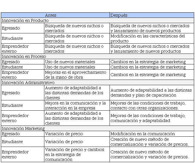 Los emprendedores egresados realizaron cambios en la gestión administrativa enfatizando en la capacitación de ellos y sus colaboradores, a partir de los encuentros (reunión de negocios y conversatorios) manifestaron la importancia de la formación constante. Los emprendedores estudiantes y externos consideraron mejorar las condiciones de trabajo, la comunicación interna y el contacto con otras organizaciones, el cambio se considera positivo ya que uno de los conversatorios durante el proyecto fue la vinculación de las empresas con otros sectores para realizar innovaciones, además, es una de las actividades de vinculación definidas por D’Este et al. (2014).