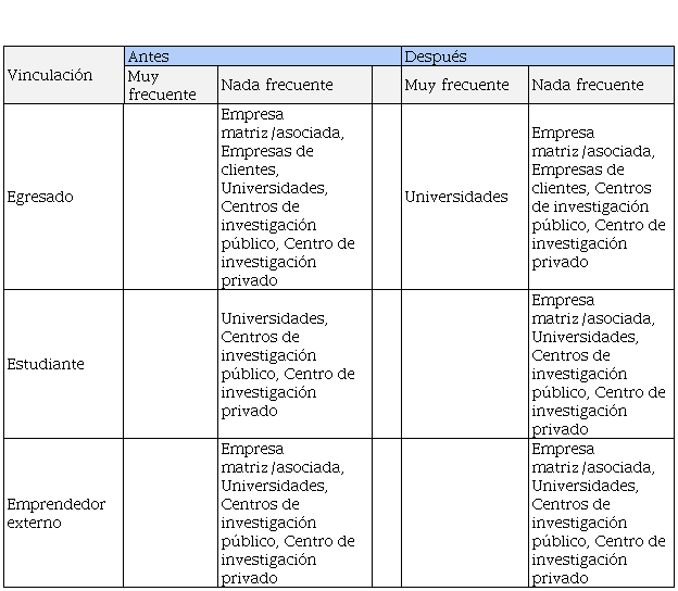 La tabla 2 muestra la relación que los emprendedores tuvieron antes y después de formar parte del proyecto. El único cambio que se visualiza es en los egresados, donde su vinculación con universidades fue con mayor frecuencia luego de participar de las actividades. Para iniciar una vinculación con otros sectores/empresas o centros de investigación, se debe generar confianza (Escalante Ferrer et al., 2020) y para ello, se requiere generar el ambiente propicio donde la relación sea formal y a largo plazo. En el contexto de la investigación, esta relación aún es débil, ya que los emprendimientos son MIPYMES y se han lanzado al mercado por necesidad y no así por oportunidad.